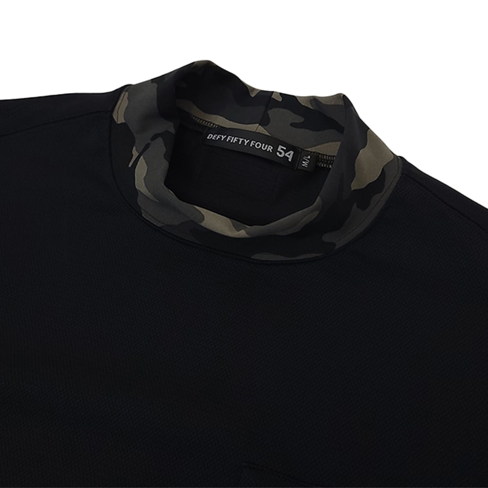 SOFTCOOL MOCK セラミック粒子により糸から触れた瞬間ひんやりと冷たく涼しい快適素材SOFTCOOLを使用したも半袖モックネック。ネック部位は,2WAYトリコットのカモ柄にて配色。ストレッチ性に優れた接触冷感素材の為、SSシーズンに最適な一枚。