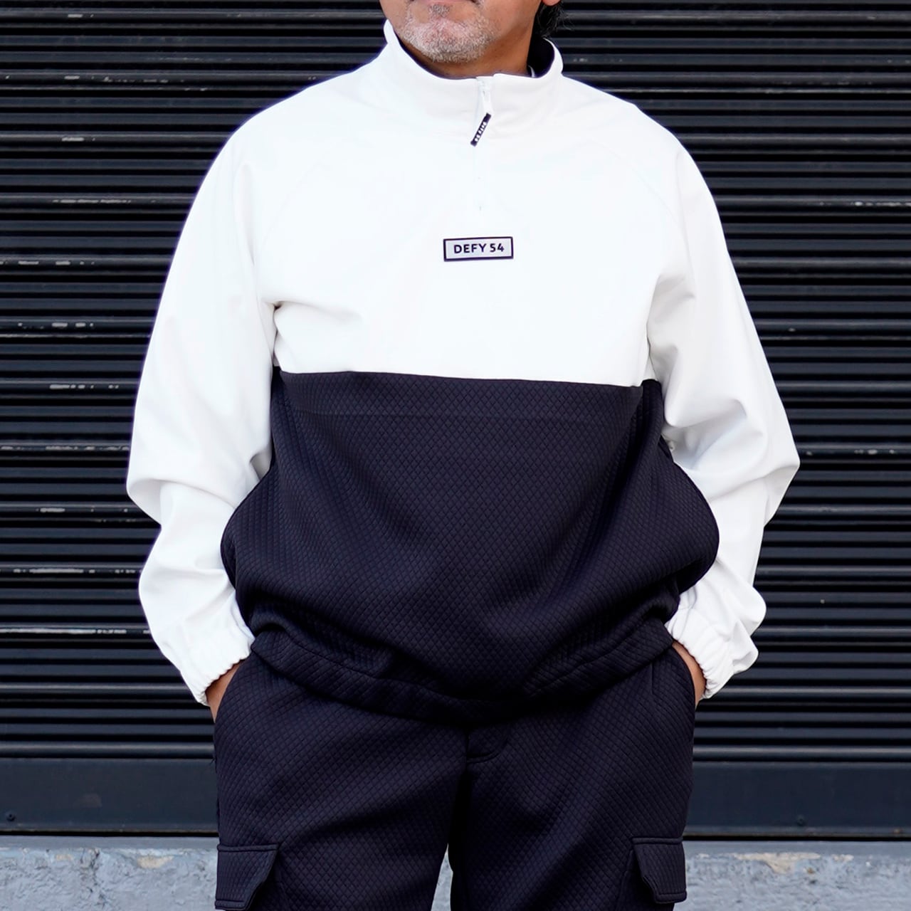 表面に防風撥水スムース、裏面に防寒性の高いフリース、中間には透湿防水フィルムを挟み込んだ、ハイスペック機能素材と、ニットジャガードを組み合わせた防寒ブルゾン。風の侵入を防ぎ、透湿効果によって衣服内を常に快適な状態でキープしてくれます。防寒にも最適な一枚。