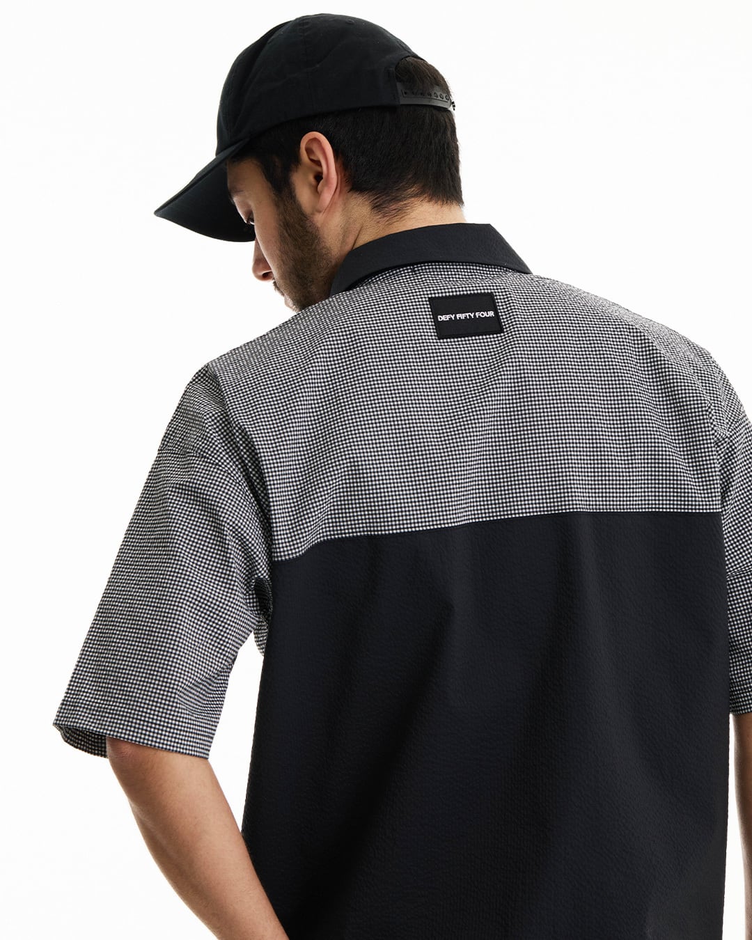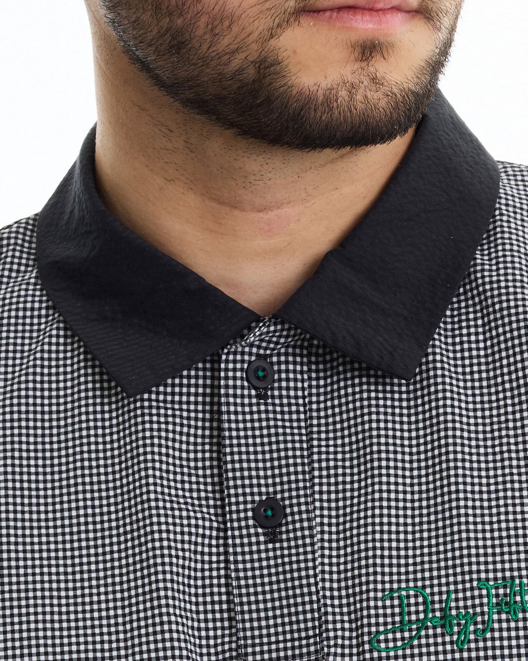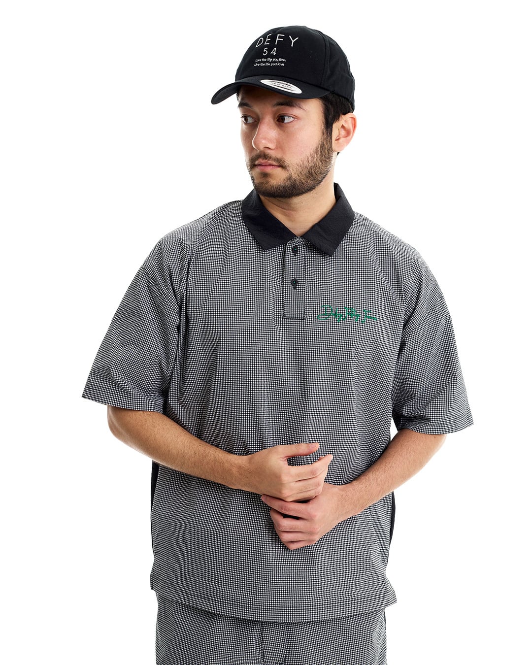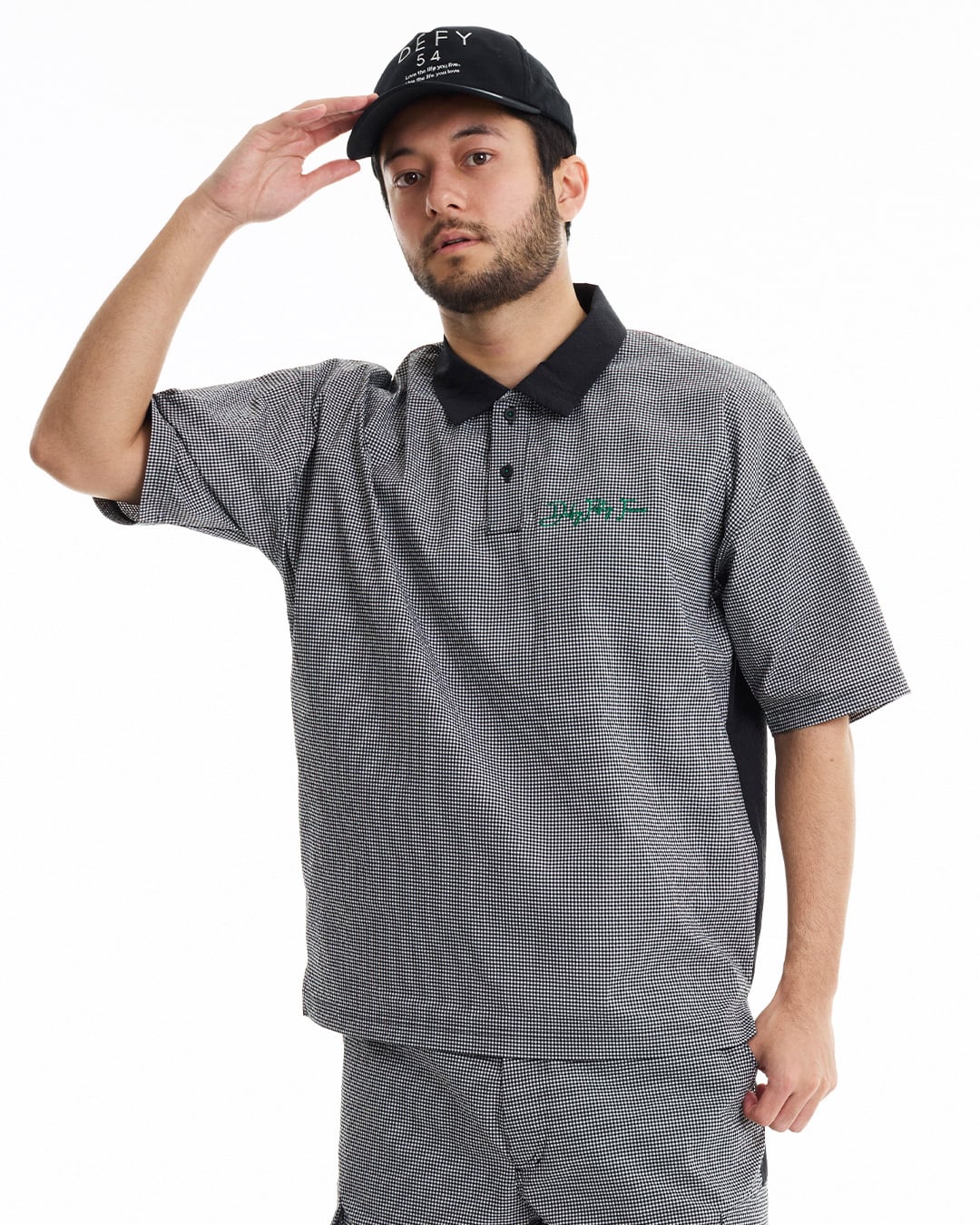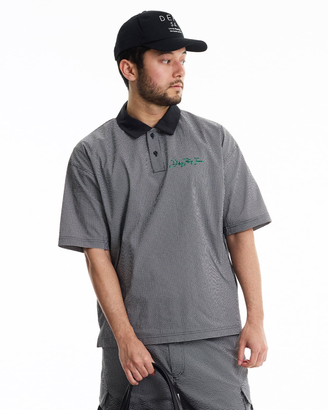 COOLMAX®インビスタ社商標(コアテクノロジーにより涼しくドライな着心地を提供しパフォーマンスを引き出す。)サッカー素材を使用した、ギンガム配色ショートスリーブシャツ。クールマックスの機能性と凹凸感のあるサッカー素材を使用している為、快適な着心地。セットアップカーゴショートパンツ(DFF1E17I)との着用により、より綺麗目にゆったりとしたゴルフスタイルを提案。