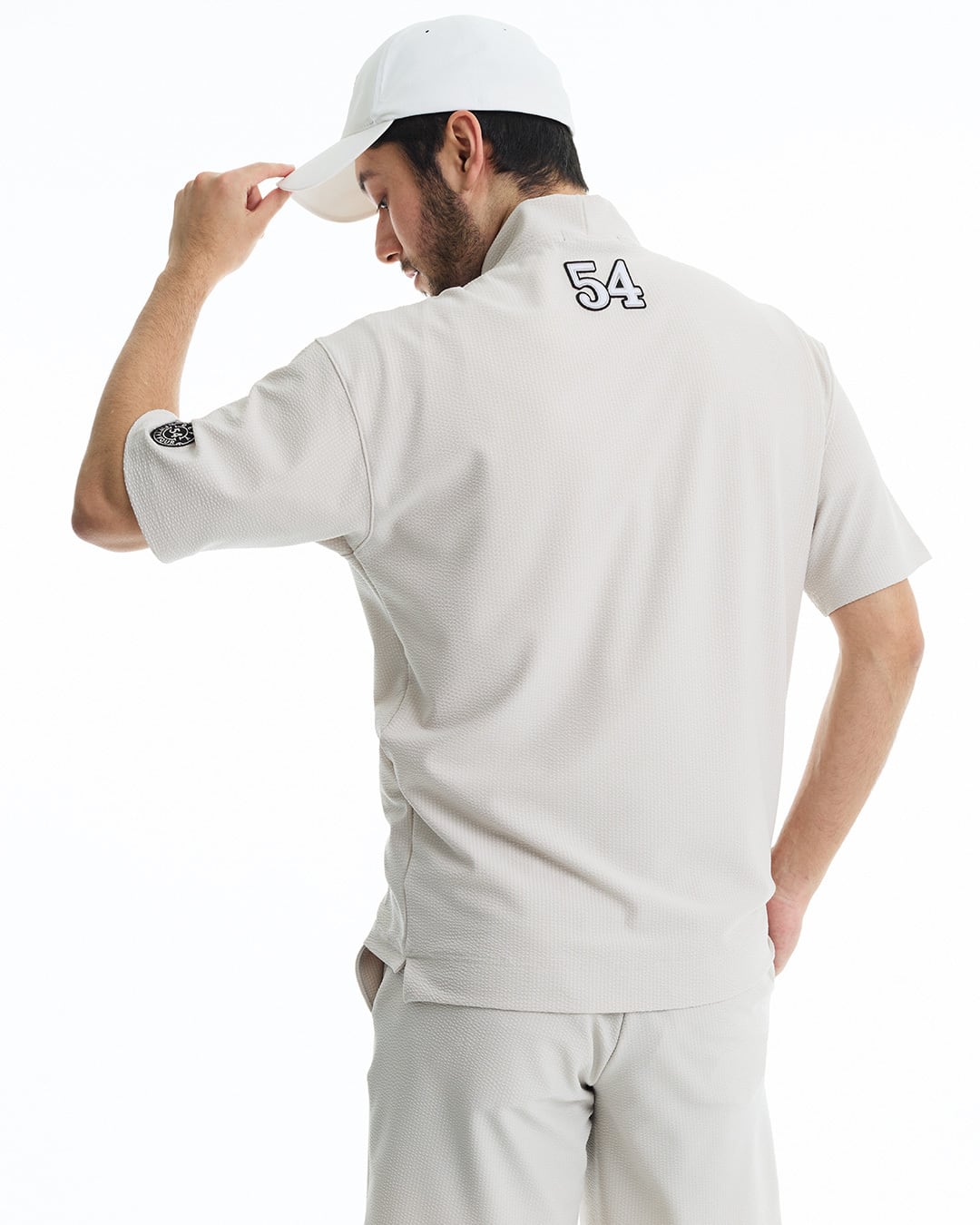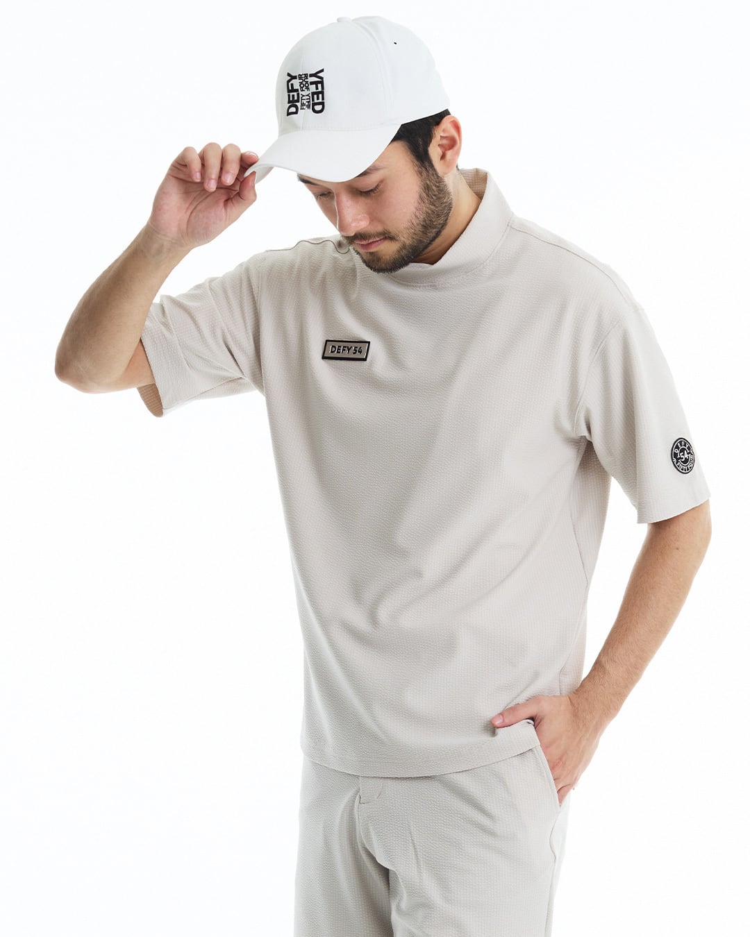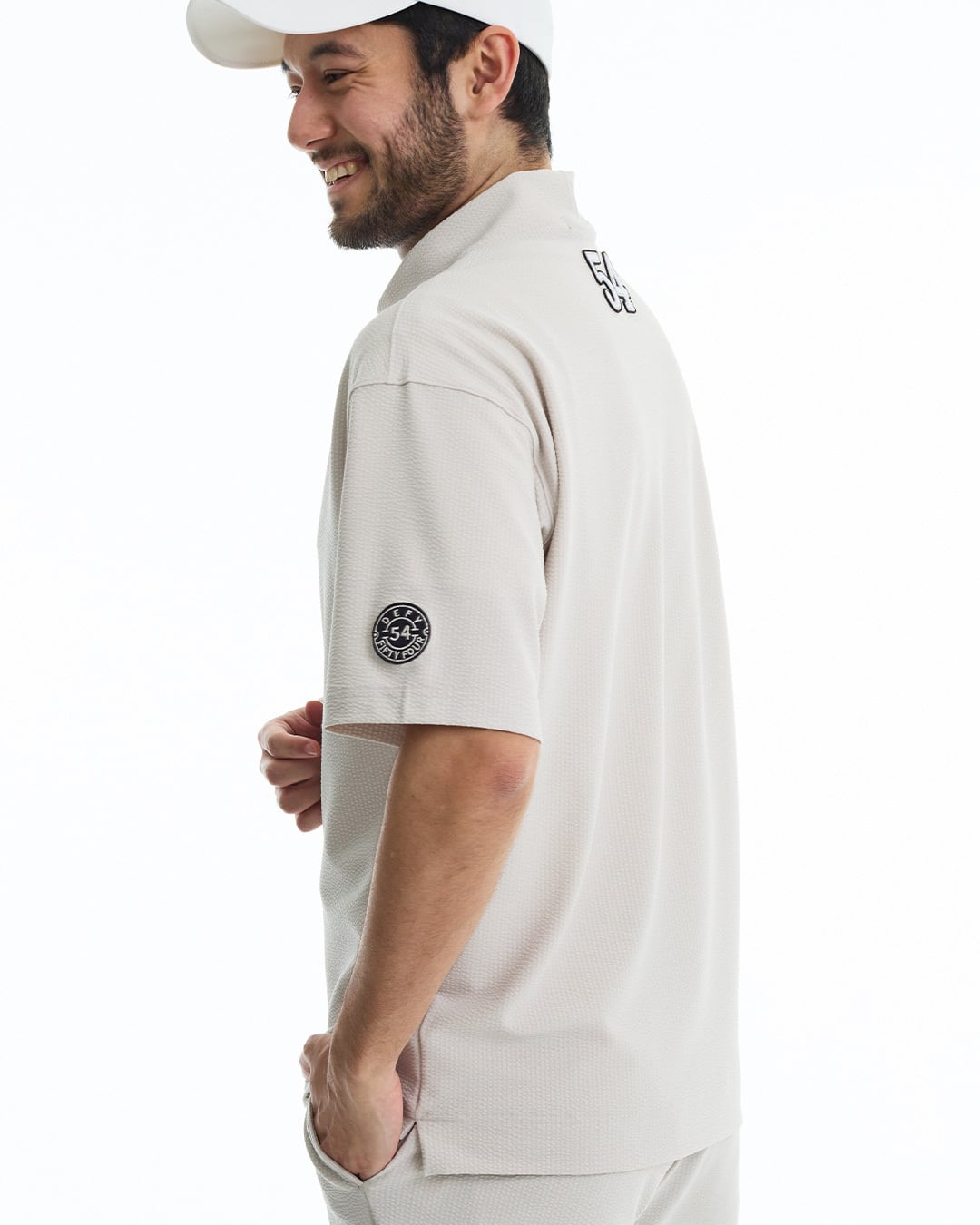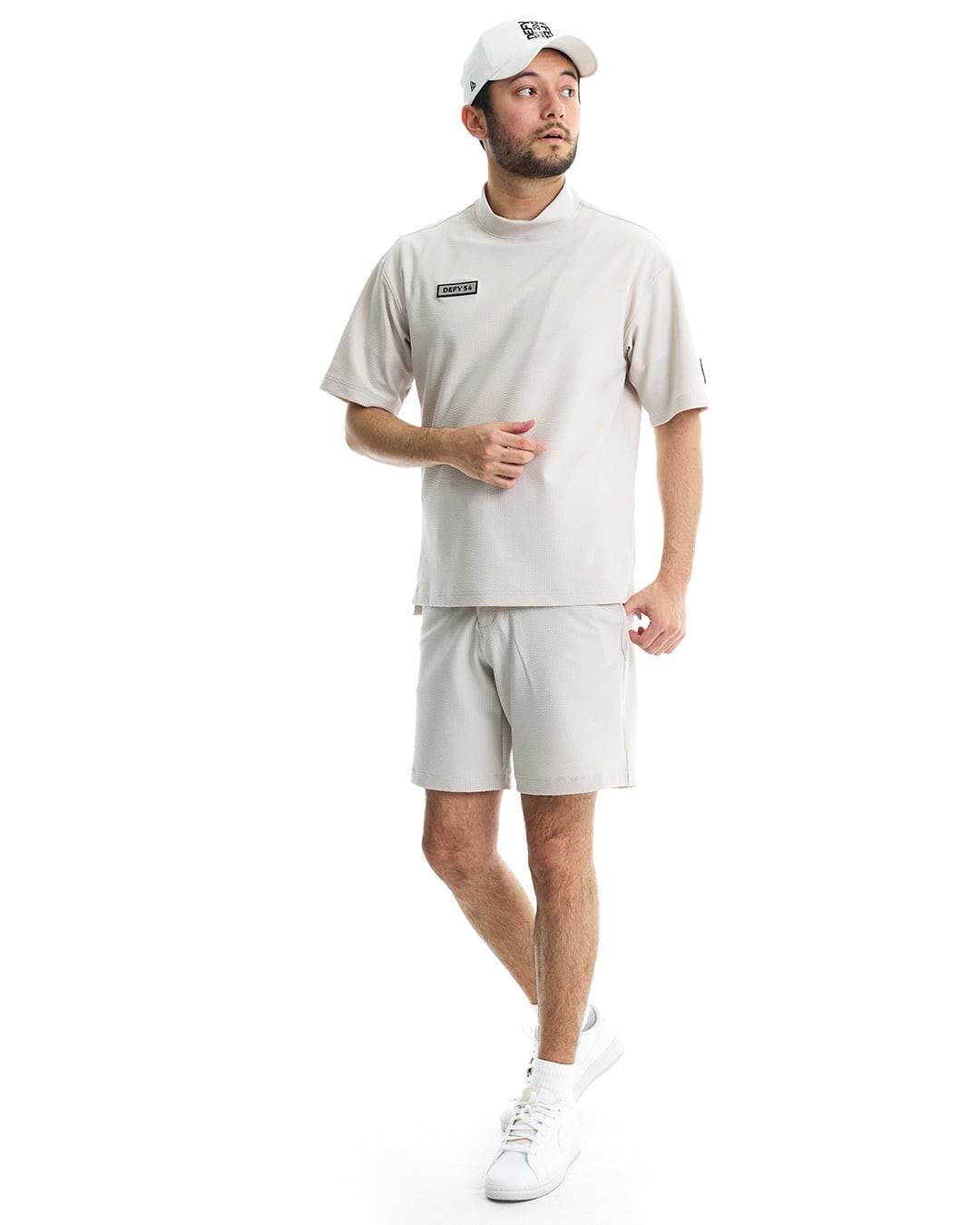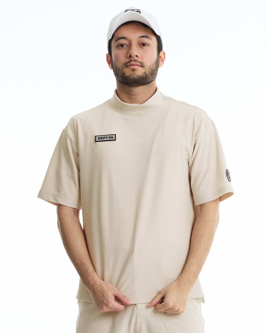 ハイテンションなサッカー素材を使用した半袖モックネック。サッカーの凹凸感が肌離れの良さ、ハリコシ感を引き立て、着心地の良いモックネックとなっている。タテヨコ共にストレッチがきいている為、動きの妨げにもならない。同素材ショートパンツ(DFF1E02I)とのセットアップ着用により、より綺麗目なスタイリングを楽しむことが出来る。同素材ボタンダウンシャツ(DFF1E01I)