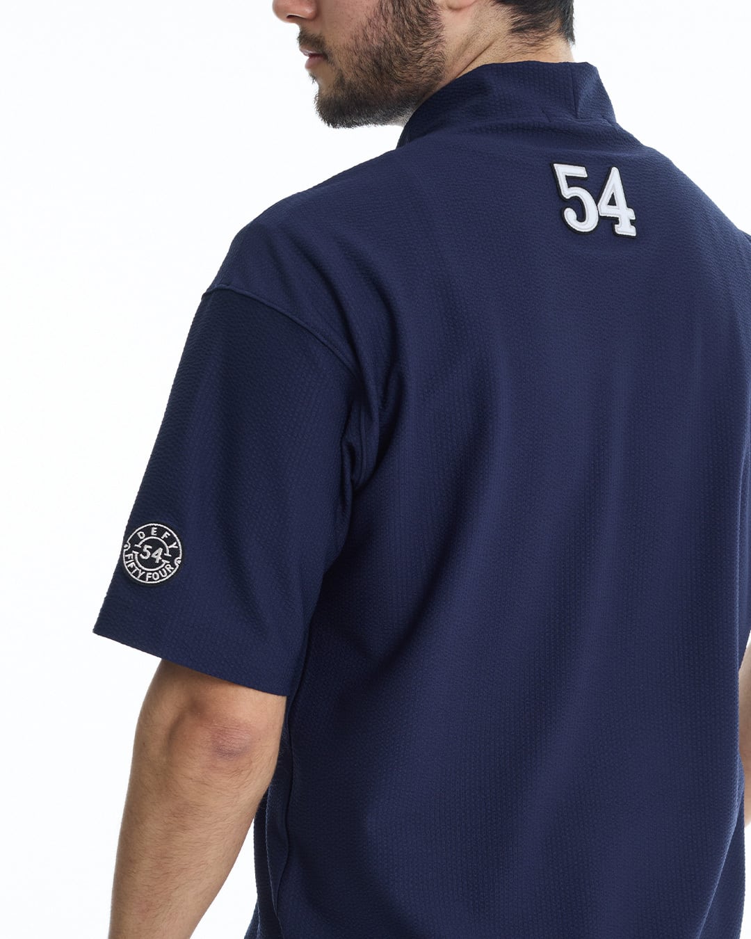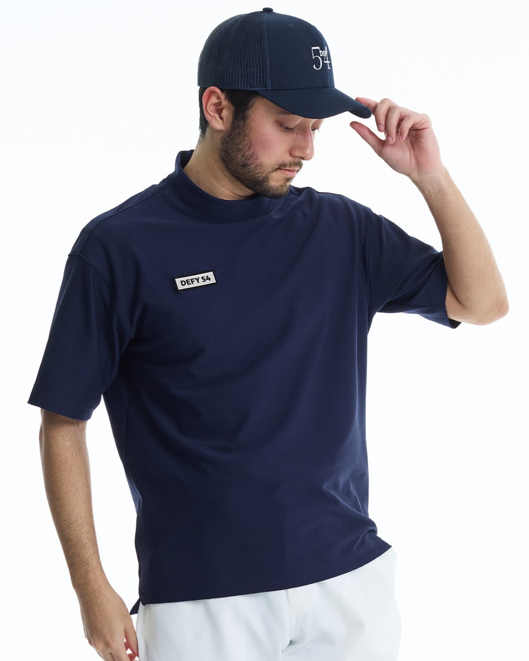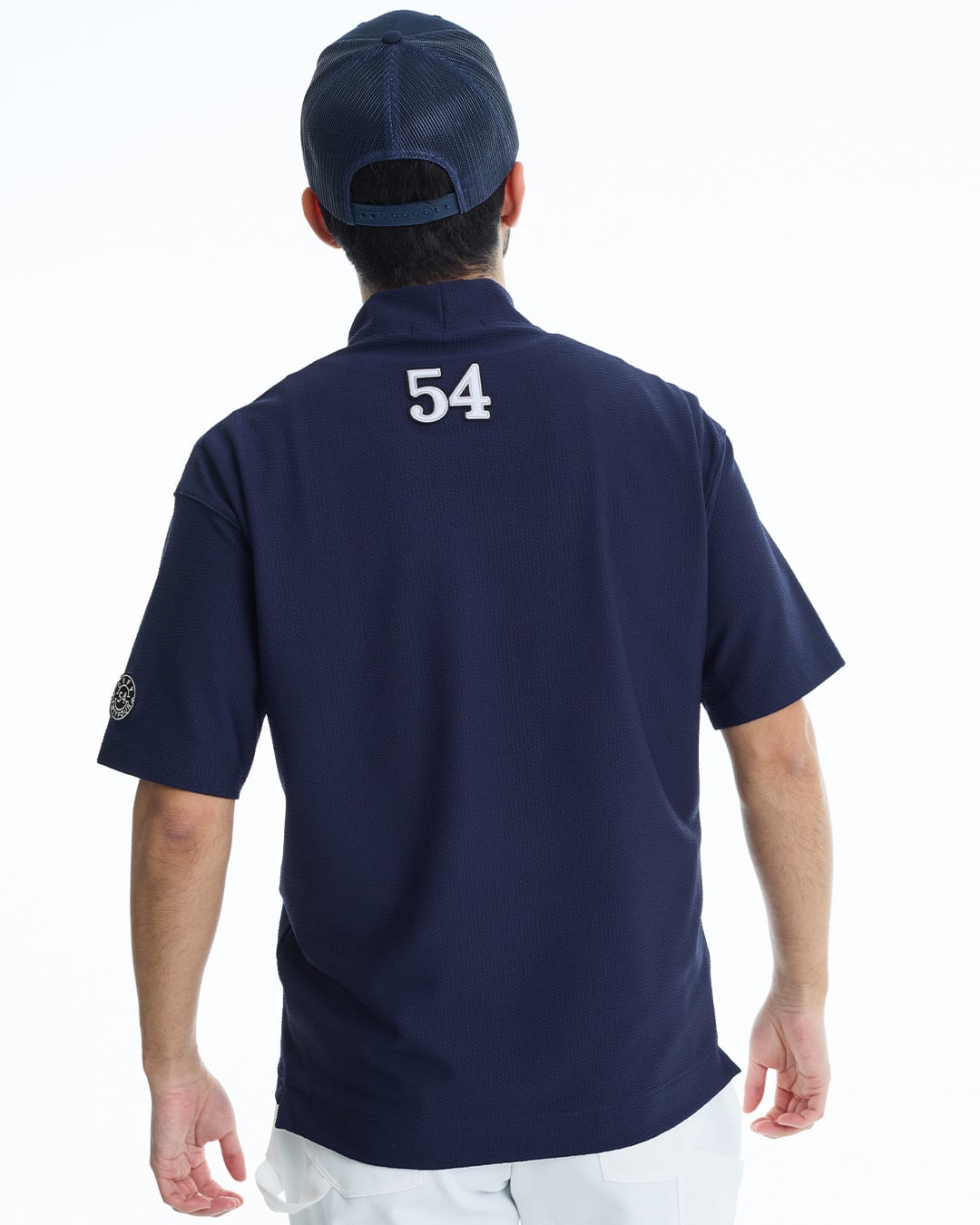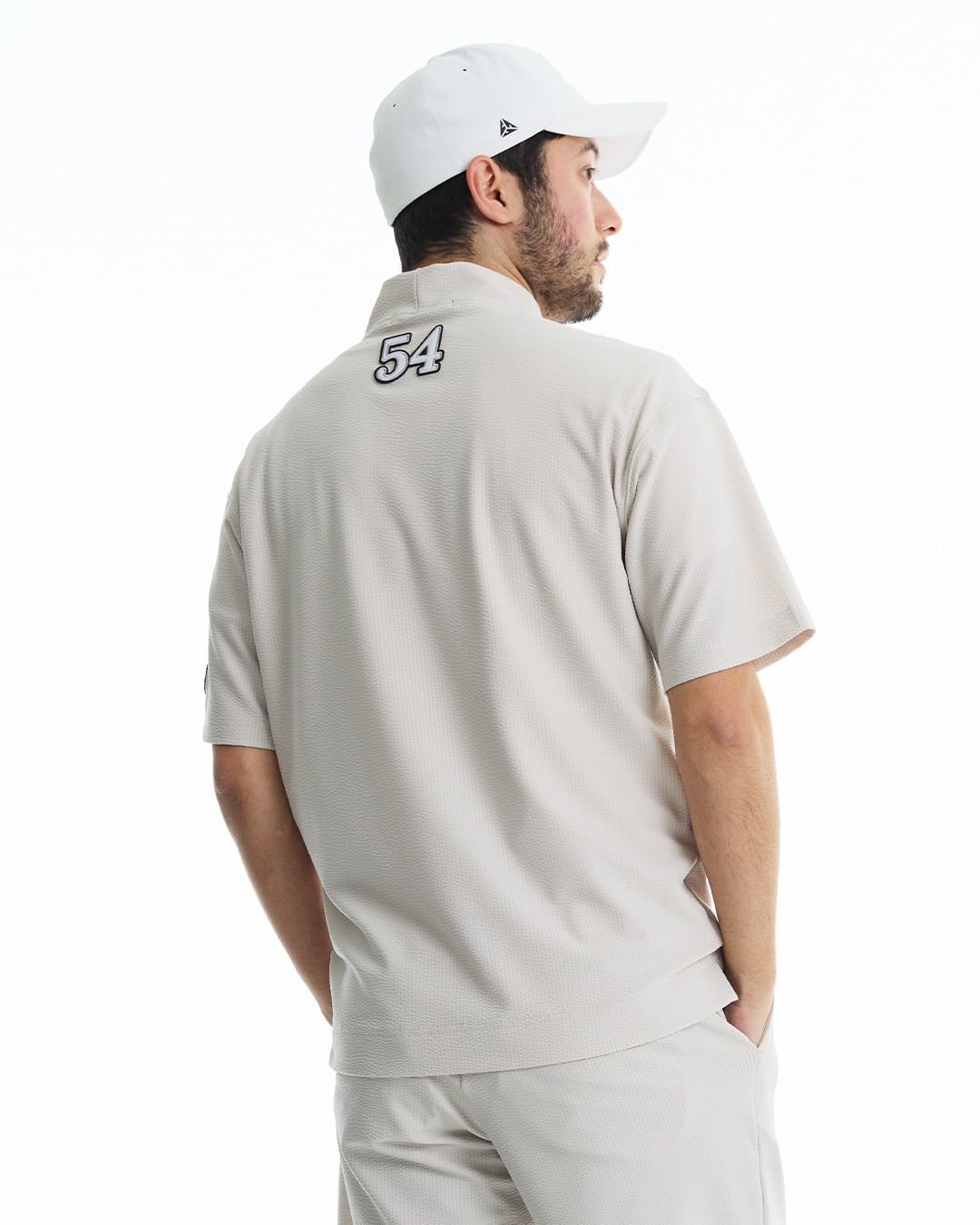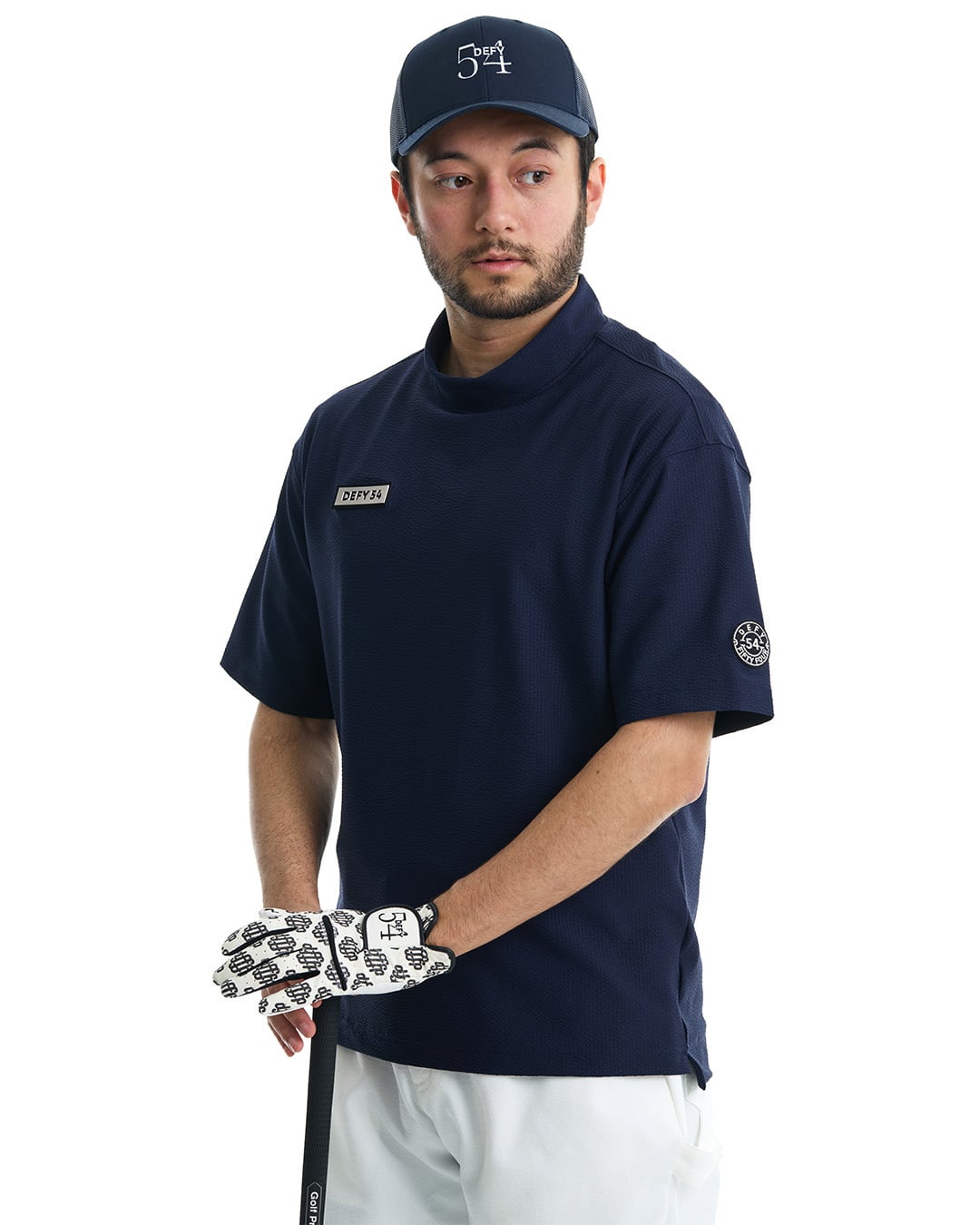 ハイテンションなサッカー素材を使用した半袖モックネック。サッカーの凹凸感が肌離れの良さ、ハリコシ感を引き立て、着心地の良いモックネックとなっている。タテヨコ共にストレッチがきいている為、動きの妨げにもならない。同素材ショートパンツ(DFF1E02I)とのセットアップ着用により、より綺麗目なスタイリングを楽しむことが出来る。同素材ボタンダウンシャツ(DFF1E01I)