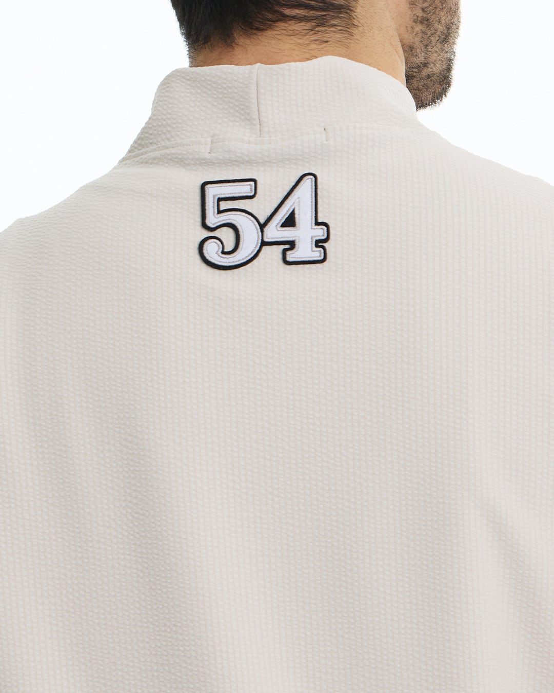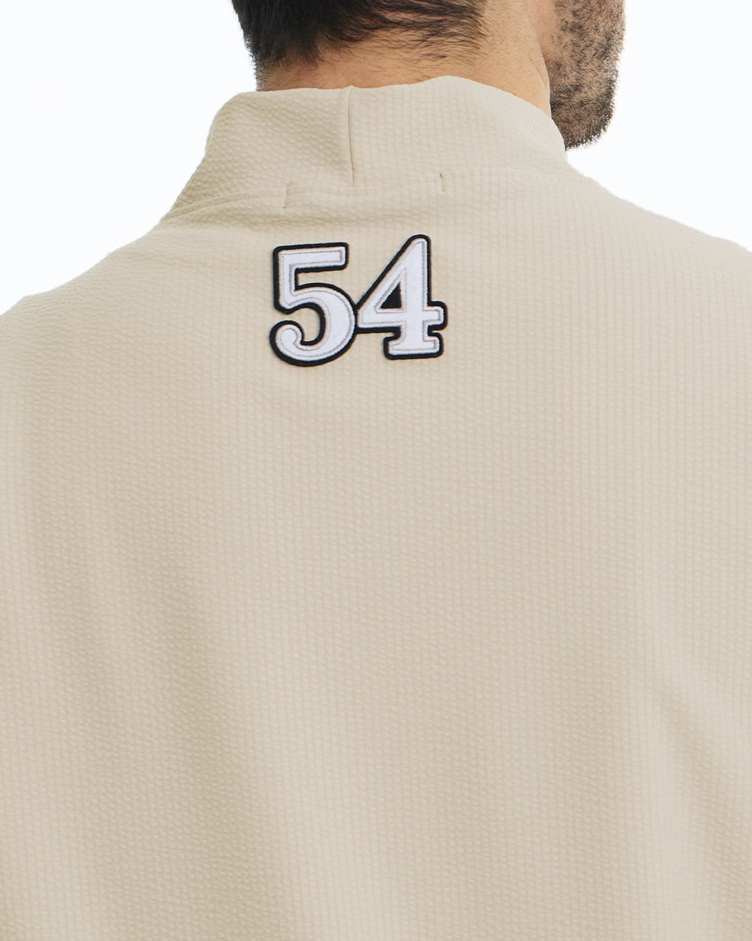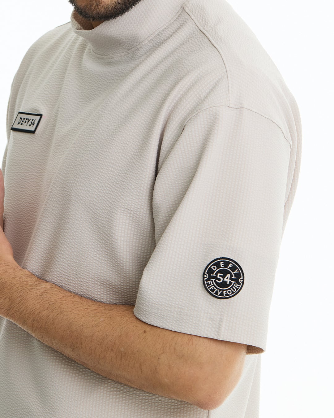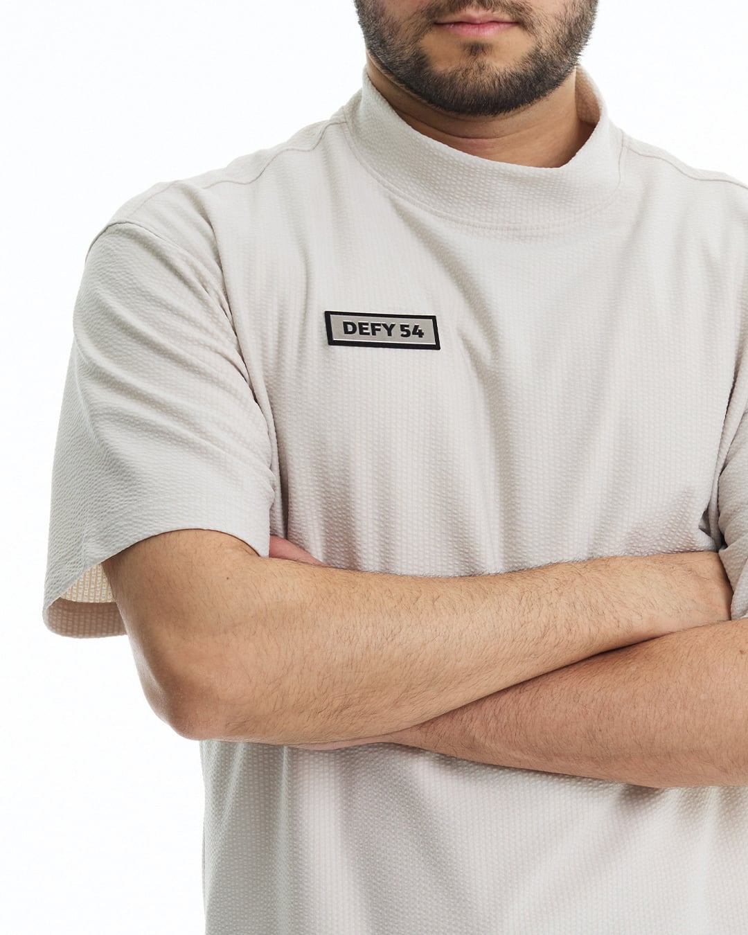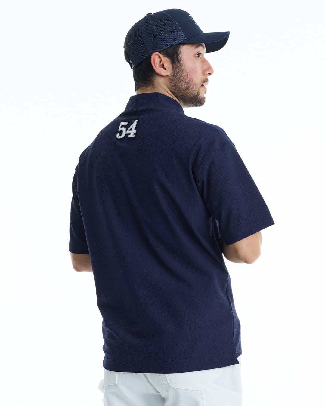 ハイテンションなサッカー素材を使用した半袖モックネック。サッカーの凹凸感が肌離れの良さ、ハリコシ感を引き立て、着心地の良いモックネックとなっている。タテヨコ共にストレッチがきいている為、動きの妨げにもならない。同素材ショートパンツ(DFF1E02I)とのセットアップ着用により、より綺麗目なスタイリングを楽しむことが出来る。同素材ボタンダウンシャツ(DFF1E01I)