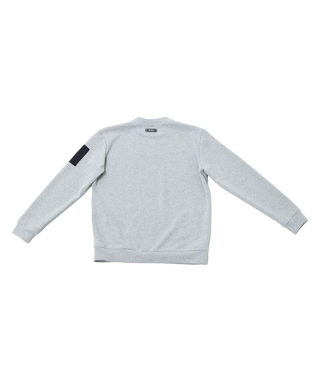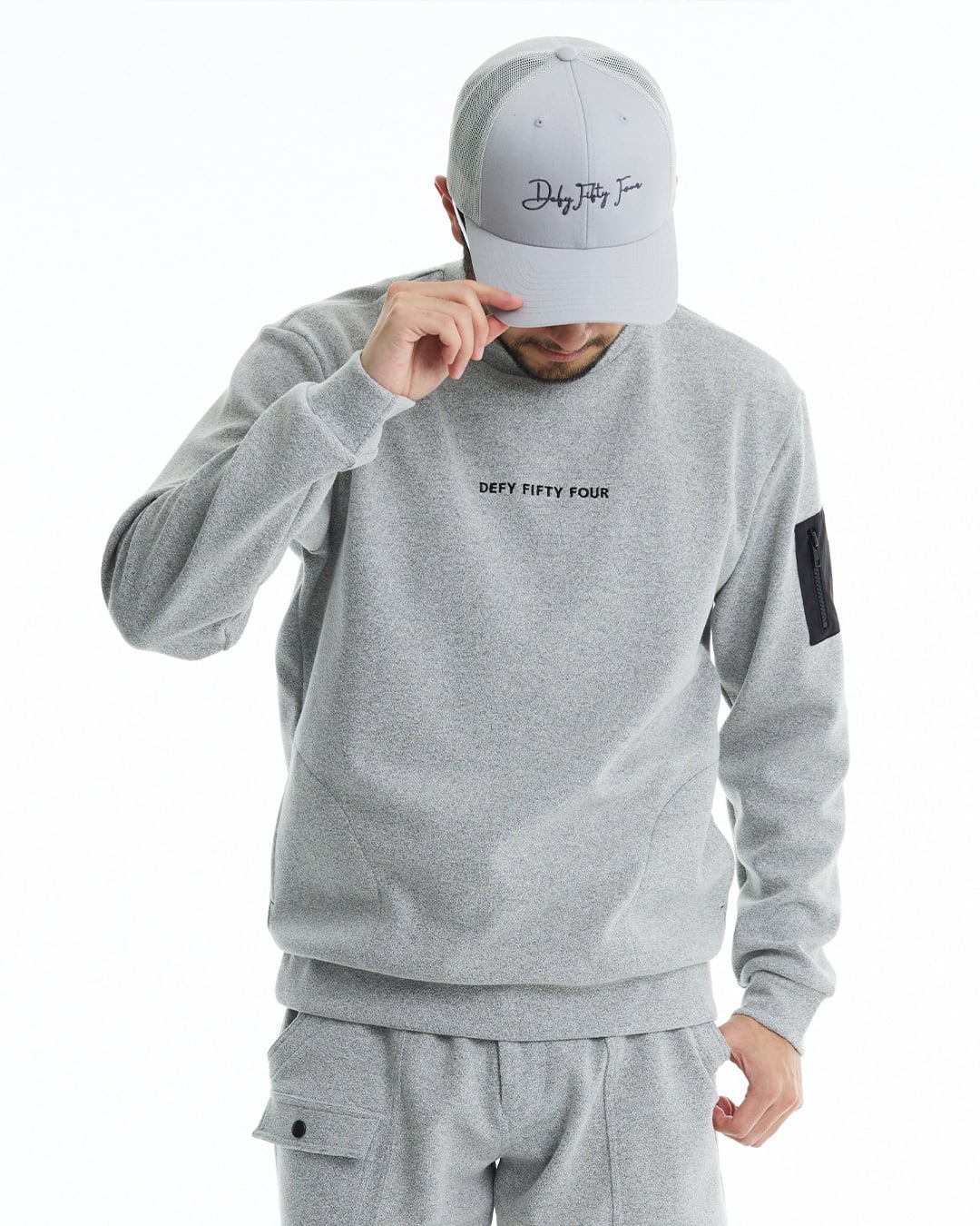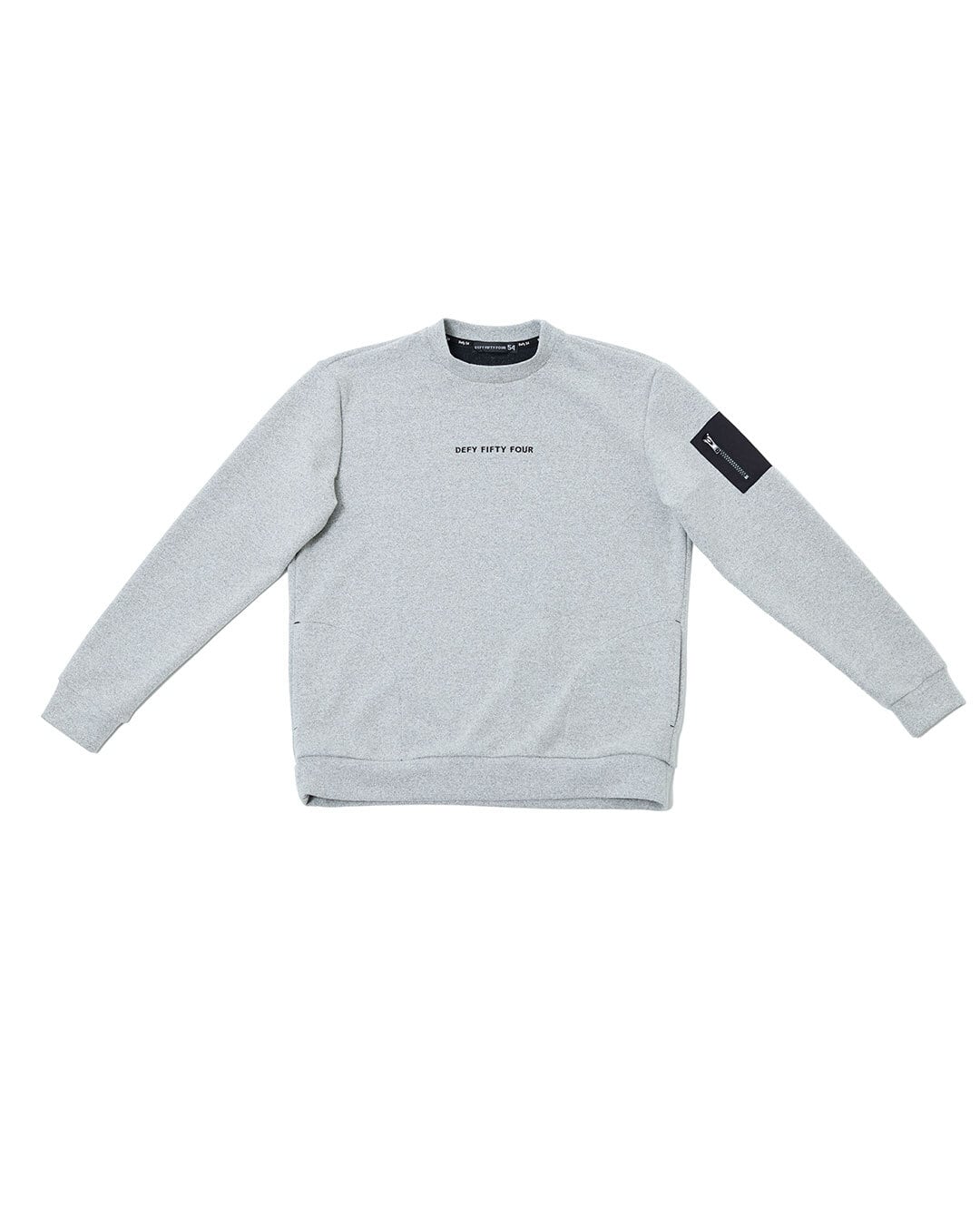 ダブルニットの表糸にブークレー糸を使用。他にない表面感を表現したプルオーバー。袖には別素材ファスナー付きポケットあり。ハリ感があり、ゴルフからデイリーまで幅広く、綺麗目なスタイリングに重宝する一枚。同素材ショートパンツ(DFF1E23I)もありセットアップ着用可。