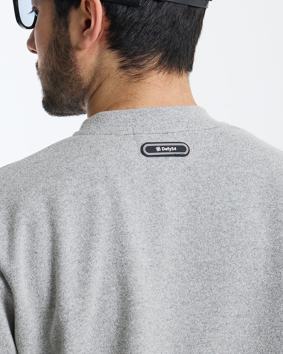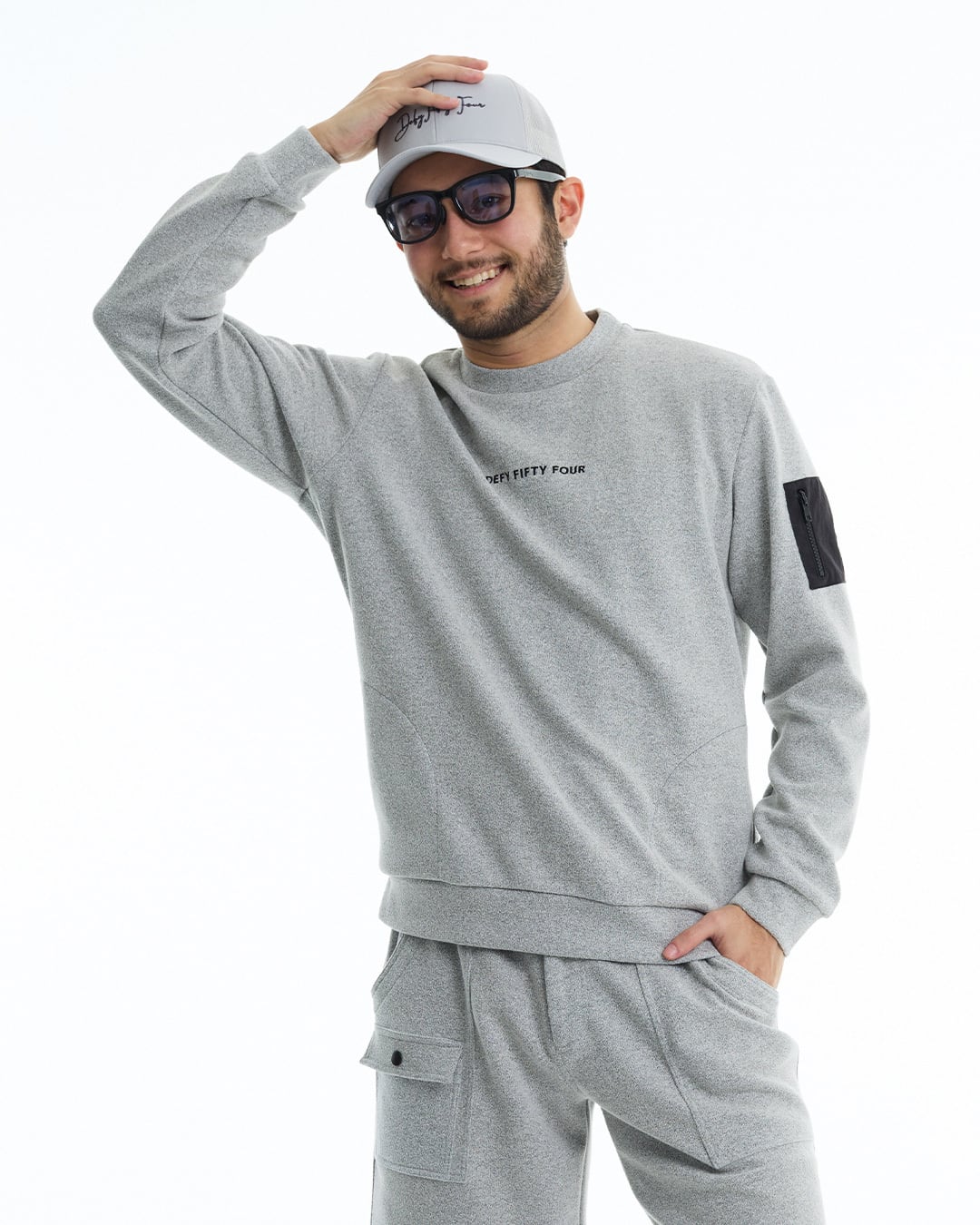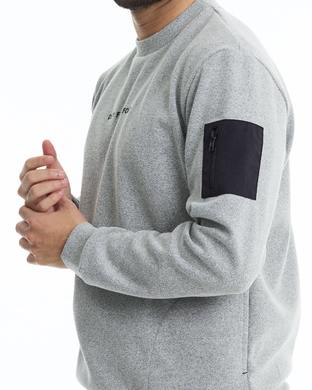 ダブルニットの表糸にブークレー糸を使用。他にない表面感を表現したプルオーバー。袖には別素材ファスナー付きポケットあり。ハリ感があり、ゴルフからデイリーまで幅広く、綺麗目なスタイリングに重宝する一枚。同素材ショートパンツ(DFF1E23I)もありセットアップ着用可。
