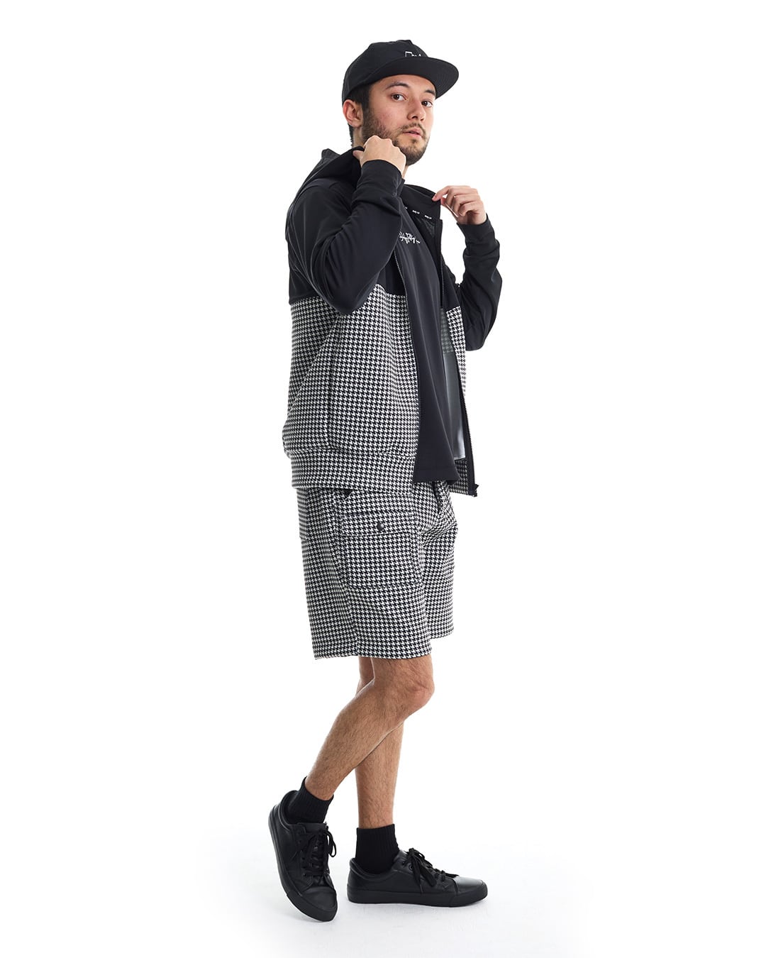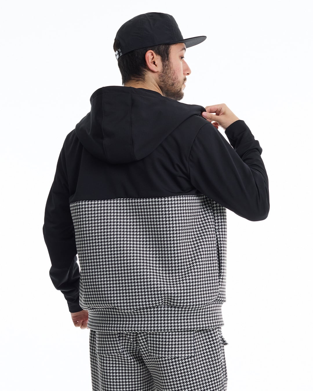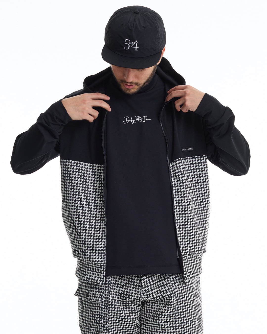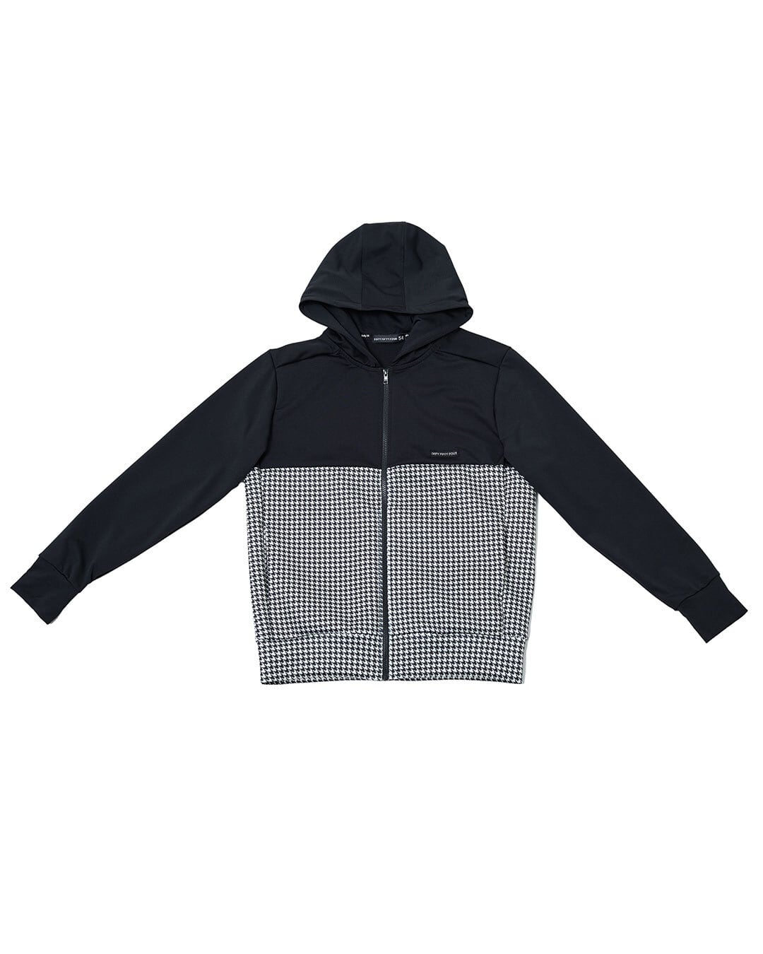 千鳥柄のストレッチジャージと特殊素材「NOSTY」(ユニチカトレーディング登録商標)を使用した配色切替フーディー。上部位素材に使用しているNOSTYは、裏面に凹凸をつくり、肌との接触面積を減らし、毛細血管現象を利用し、表面へ汗を拡散。従来の吸汗速乾素材と比べ、肌への張りつき性は10分の1以下となる。同素材ショートパンツ(DFF1E25I)あり。セットアップ対応商品