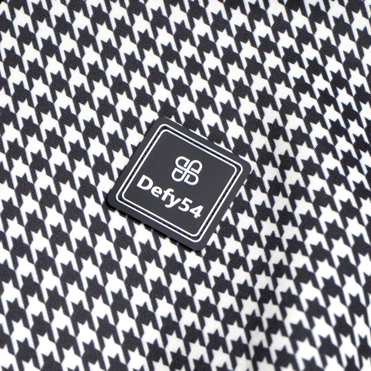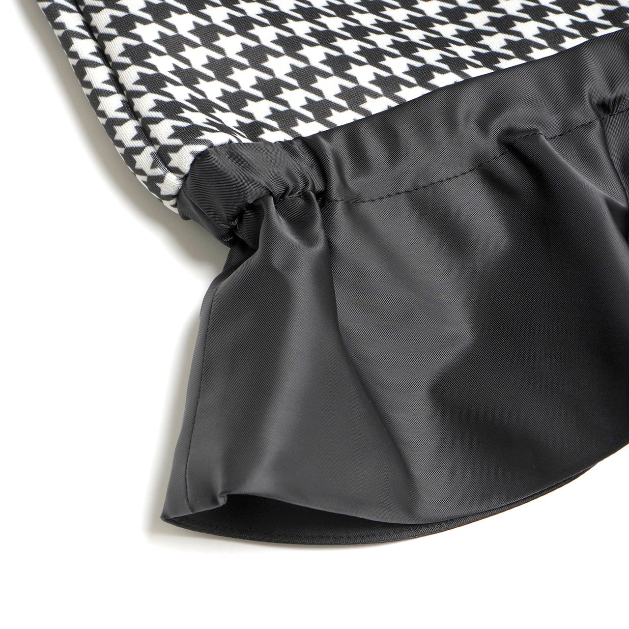 膨らみのあるダンボール素材に千鳥柄をプリント。軽量で温かみがある素材に、ナイロンフード、裾にフリルをあしらい女性らしさをプラスした一枚。